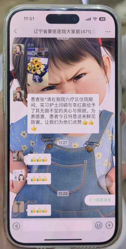 我校护理专业的19名学生是今年7月10日起在辽宁省蒙医医院开始岗位实习的。在实习期间,闫硕、李红晨两位同学虚心向带教老师请教,在临床护理中始终以严谨的态度对待每一项操作,精准完成各项护理任务;她们细致观察患者病情变化,及时反馈沟通,为诊疗提供了有力支持;她们传递护理温度,用温暖的话语和贴心的照护让患者在治疗期间感受到了家人般的关爱。患者及家属的由衷赞誉,“特别致谢实习生”的举动,不仅是对闫硕、李红晨两位同学个人努力的最好嘉奖,更折射出我校“修德砺能”校训精神在实践中的生动绽放。