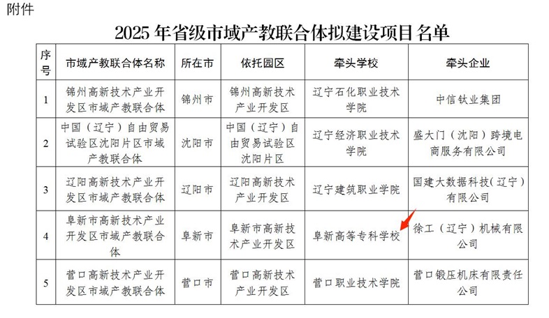 2. “阜新高新区市域产教融合联合体”由阜新高等专科学校牵头组建,联合阜新市高新产业园区、徐工(辽宁)机械有限公司等十余家阜新本地装备制造类企业及市中职校共同建设。