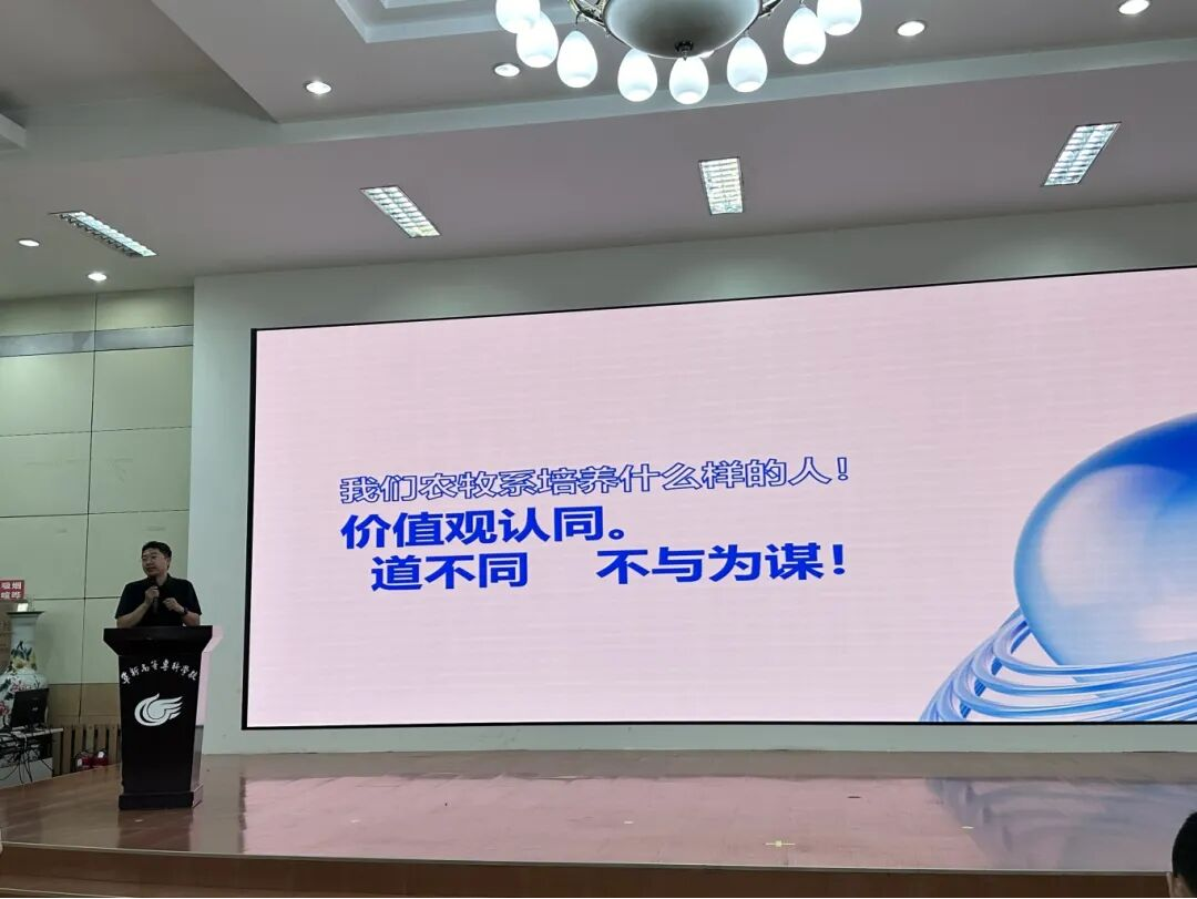 接着,农牧系主任王学恩老师介绍现代农牧产业发展情况及农业重要地位,还详述了阜新市的历史沿革以及农牧系专业设置情况和特色优势,阐述学生培养目标和就业前景,期望新生珍惜大学时光。