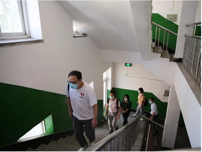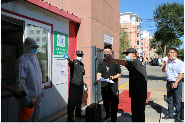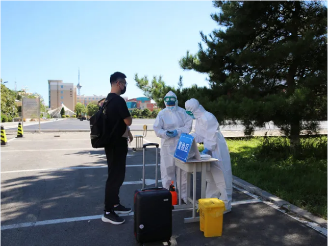 学生公寓已实施全面预防性消毒,学生完成校门报到流程,持体检合格证,沿规定路线来到公寓报到处,在楼门外间隔1米等候。公寓负责人查验 “辽事通健康通行码”和“国务院客户端防疫行程卡”、复测体温、进行休整期管理和卫生知识宣教,放行学生进入宿舍。