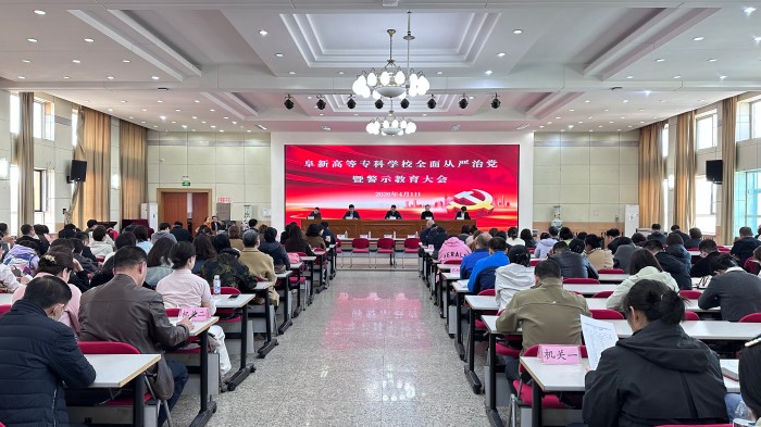 为深入学习贯彻习近平总书记在二十届中央纪委五次全会上的重要讲话和全会精神,认真落实2026年全省、全市教育系统全面从严治党工作会议要求,4月1日,阜新高等专科学校在尚学楼五楼报告厅召开2026年全面从严治党暨警示教育大会,总结工作、分析问题,部署年度重点任务,并组织集中观看警示教育片,以案为鉴、以案明纪、以案促改,以全面从严治党新成效保障学校“十五五”高质量开局。党委书记杨德华出席会议并讲话,学校领导班子成员、中层干部、全体党员以及各教研室主任参加会议。会议由党委副书记刘振宇主持。